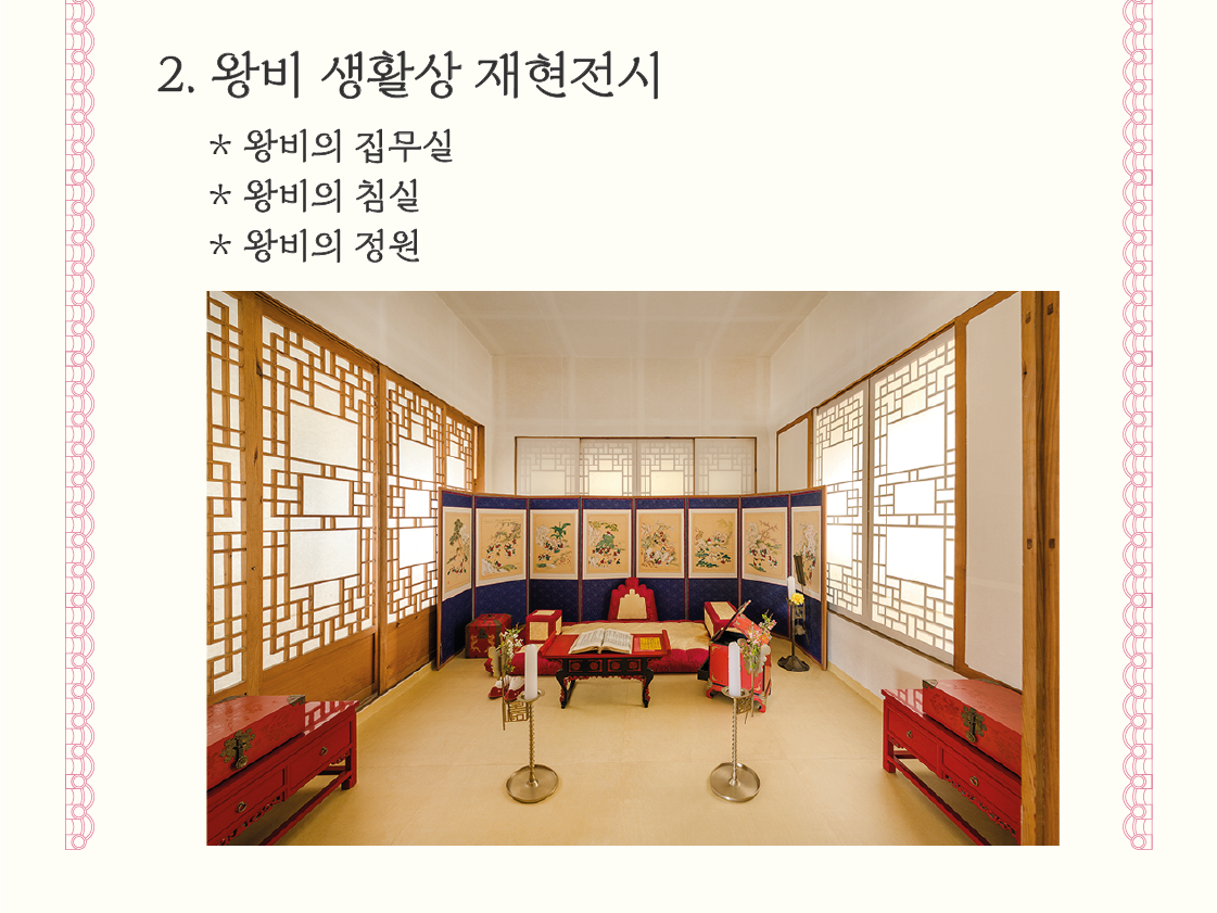 - 온돌방 – 왕비 생활상 재현 유물 전시