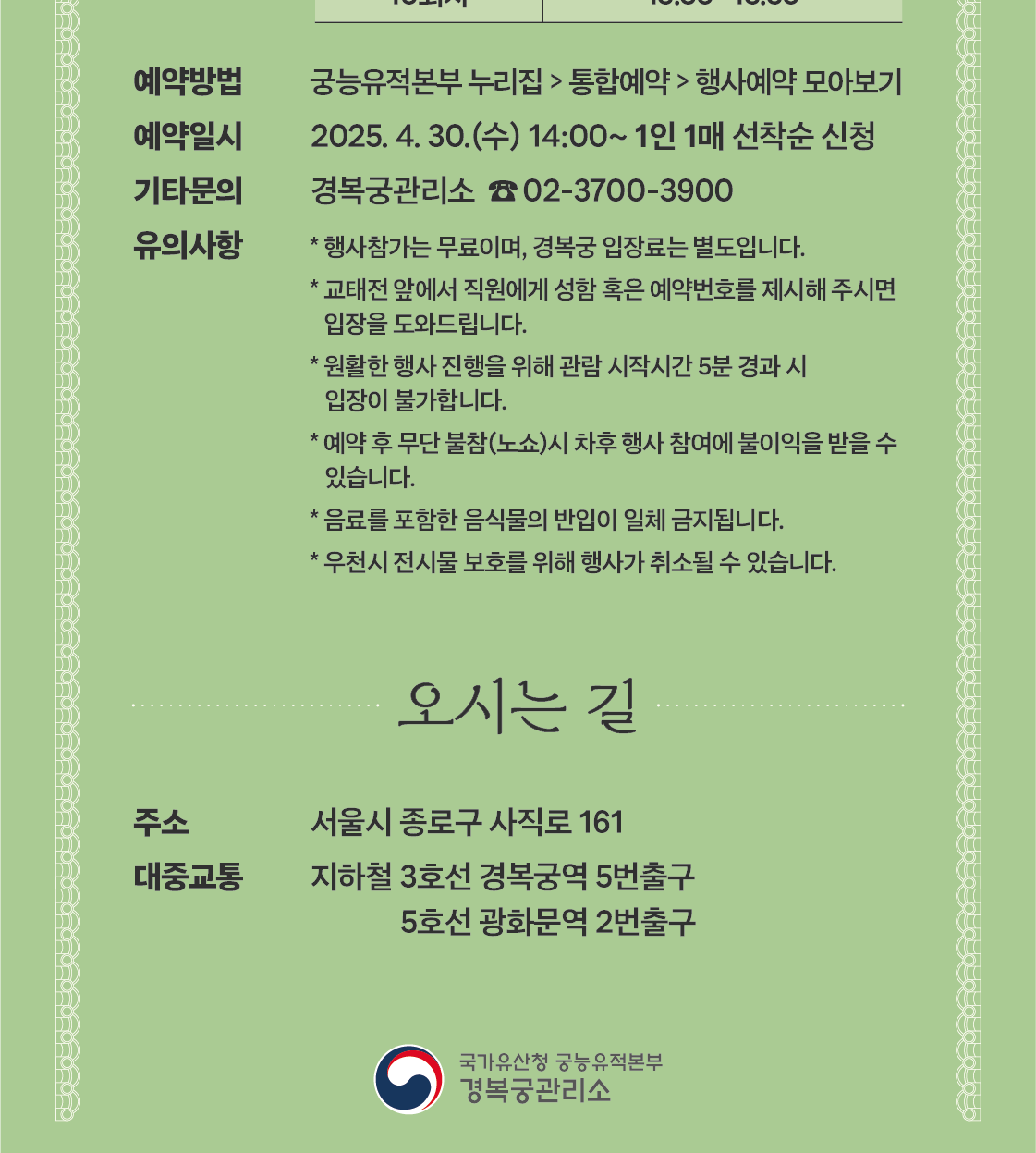 - 교태전 앞에서 직원에게 성함 혹은 예약번호 제시하고 입장 가능