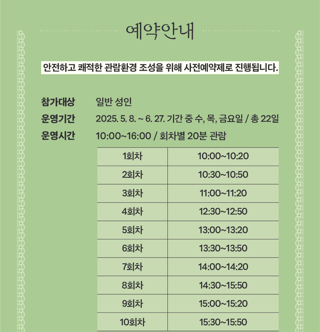- 관람 기간: 2025년 5월 8일(수) ~ 6월 27일(금), 매주 수, 목, 금 운영 / 총 22일간