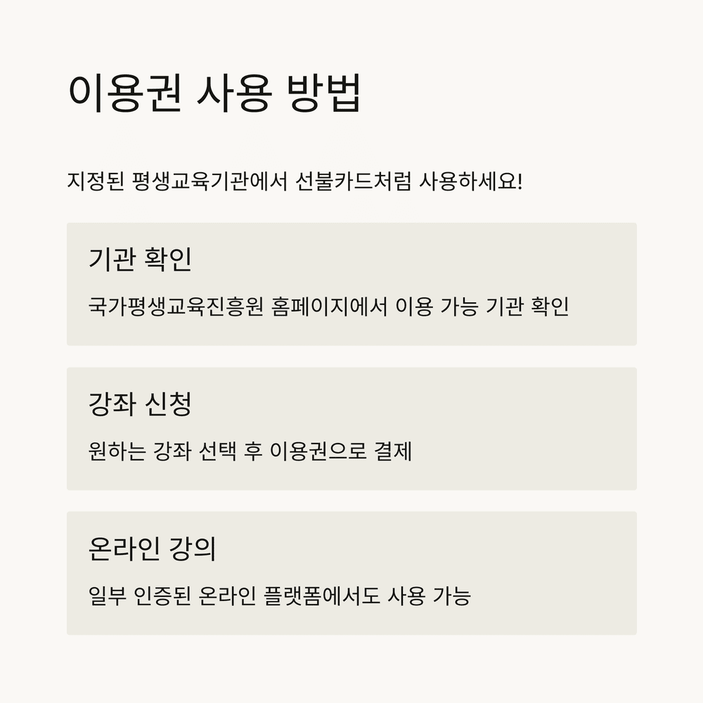 이용권이 발급되면 지정된 평생교육기관에서 강좌를 신청할 수 있어요. 마치 선불카드처럼, 수강료 결제 시 이용권 금액을 차감하는 방식입니다. 이용 가능한 기관은 국가평생교육진흥원 홈페이지에서 확인할 수 있고, 일부 온라인 강의 플랫폼에서도 사용할 수 있답니다!